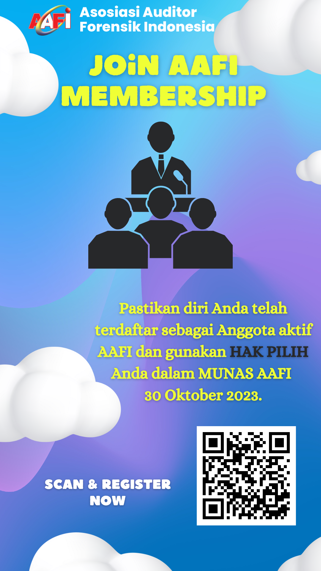 Asosiasi Forensik Auditor Indonesia (AAFI SIRIT) mengundang Bapak/Ibu Anggota Aktif AAFI SIRIT untuk melakukan pendaftaran Musyawarah Nasional (MUNAS) AAFI SIRIT yang direncanakan akan dilaksanakan pada 30 Oktober 2023. Silakan melakukan pendaftaran di website AAFI SIRIT dengan alamat www.aafisirit.org/2023. Jangan lupa siapkan Sertifikat Certified Forensic Auditor (CFrA) dan Bukti Iuran Tahunan AAFI SIRIT saat pendaftaran.