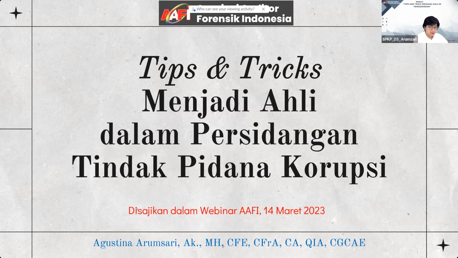 Terkait hal itu, AAFI SIRIT menggelar webinar bertajuk Tips and Tricks Menjadi Ahli di Persidangan yang menghadirkan Ibu Agustina Arumsari, Ak., M.H., CFE, CFrA, CA, QIA, CGCAE (Deputi Investigasi BPKP) sebagai Narasumber dan Ibu Dr. Selvia Vivi Devianti S.E., M.Sc., MCP., Ak, CFrA, CFE, CSFA (Direktur Litbang BPK RI) selaku Moderator.�