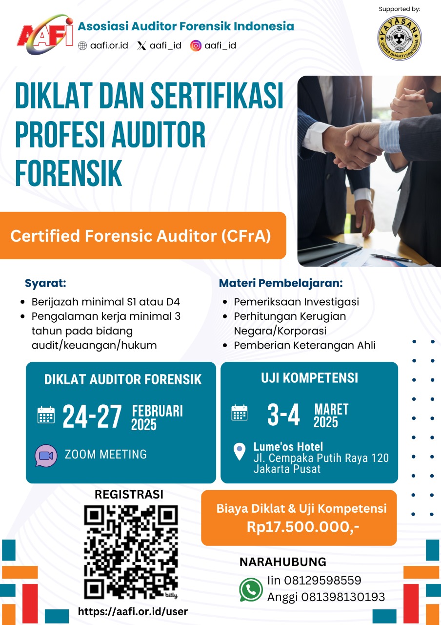 Asosiasi Auditor Forensik Indonesia Sirit (AAFI SIRIT), dengan dukungan dari Yayasan Cakra Bhakti Santosha, kembali mengadakan Diklat dan Sertifikasi Profesi Auditor Forensik dengan gelar Certified Forensic Auditor (CFrA). Program ini bertujuan untuk meningkatkan kompetensi para auditor dalam bidang audit investigatif dan forensik guna mendukung upaya pemberantasan tindak pidana keuangan dan korupsi.