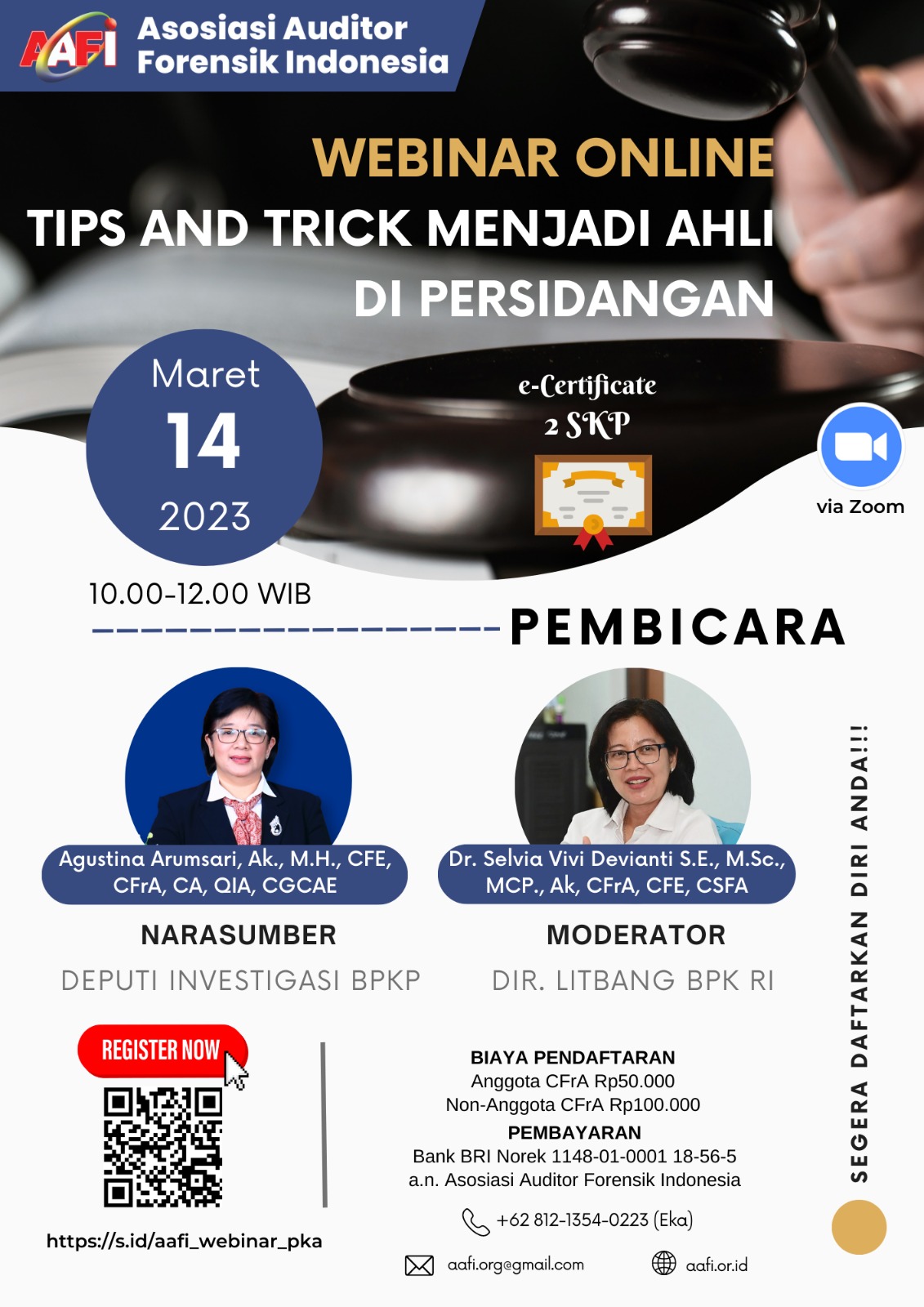Asosiasi Forensik Auditor Indonesia (AAFI SIRIT) mengundang Bapak/Ibu dalam Webinar Online dengan Tema "TIPS AND TRICKS MENJADI AHLI DI PERSIDANGAN"